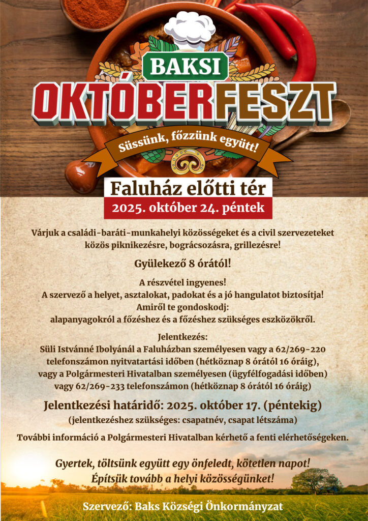 Baks község idén is vidám, közösségépítő programmal készül az őszre: 2025. október 24-én, pénteken rendezik meg a Baksi Októberfesztet a Faluház előtti téren. A szervezők arra hívják a családokat, baráti társaságokat, munkahelyi közösségeket és civil szervezeteket, hogy töltsenek együtt egy felejthetetlen napot közös főzéssel, bográcsozással és grillezéssel.