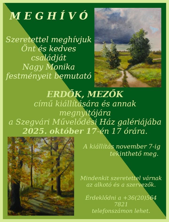 A természet szépsége kerül a figyelem középpontjába a Szegvári Művelődési Ház galériájában, ahol hamarosan megnyílik Nagy Monika festőművész legújabb tárlata. Az „Erdők, mezők” címet viselő kiállítás a művésznő tájképeit mutatja be, és ígéretes kulturális esemény a településen.
