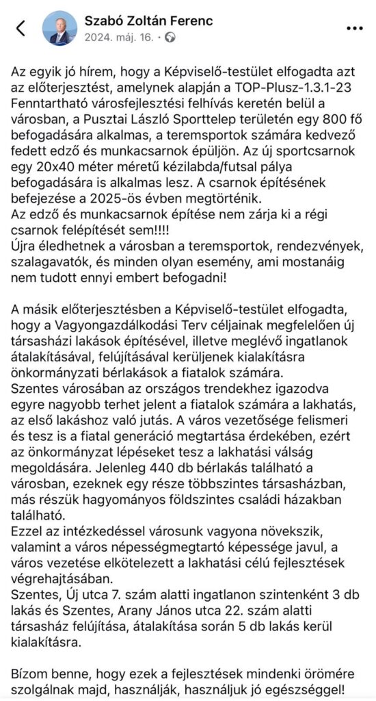 Szabó Zoltán Ferenc az önkormányzati választások hevében Facebook oldalán posztolt, ami ma is látható és olvasható. Ígéretek és “mézes madzag”. 2024 májusában bejelentette, hogy az akkori testület megszavazta az új edzőcsarnok építését, illetve, hogy új társasházi bérlakásokat fognak építeni. A hab a tortán az volt, hogy a meglévő szociális bérlakások felújítását megígérte a fiatalok számára.