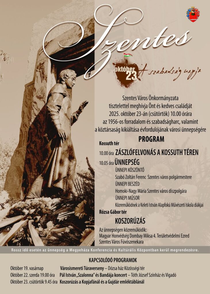 Szentes Város Önkormányzata 2025. október 23-án, csütörtökön 10 órától tartja meg az 1956-os forradalom és szabadságharc, valamint a köztársaság kikiáltásának évfordulójára rendezett városi ünnepséget.