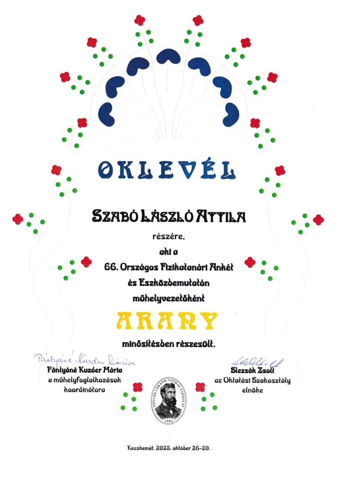 Újabb rangos elismerést hozott Csongrádra a Batsányi János Gimnázium és Kollégium egyik meghatározó tanára: Szabó László fizikatanár az idei 66. Országos Fizikatanári Ankét keretében aranyminősítést vehetett át szakmai bemutatójáért.