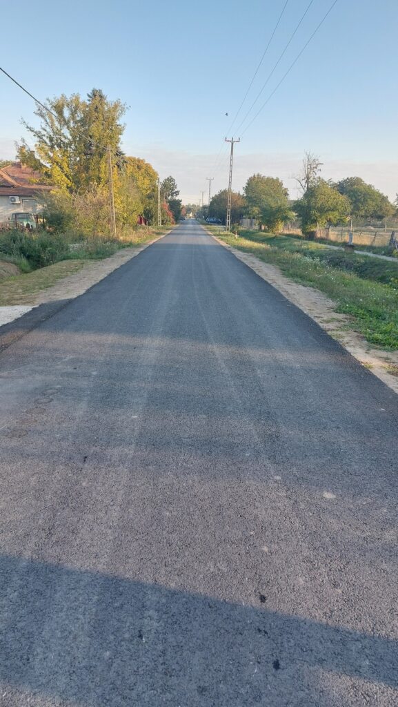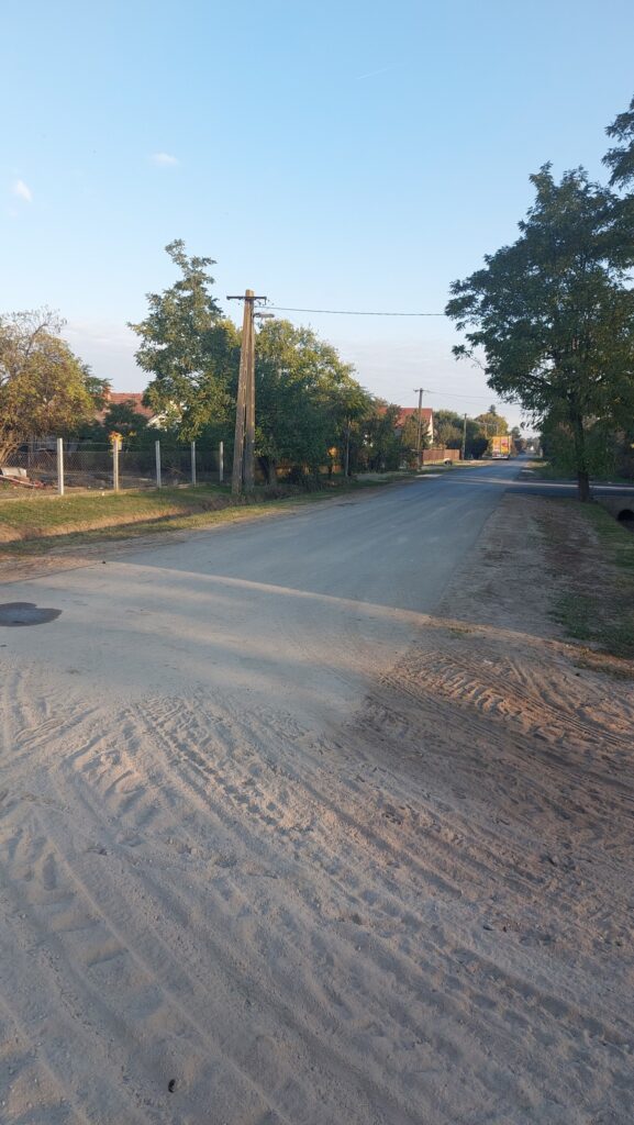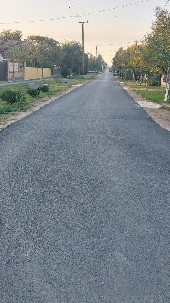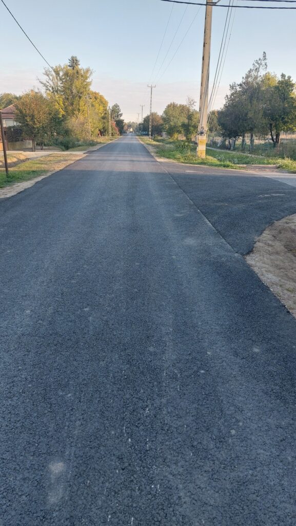 Meglévő aszfaltburkolattal rendelkező útszakasz burkolatának felújítása 6 cm aszfalt kopóréteg használatával történt.