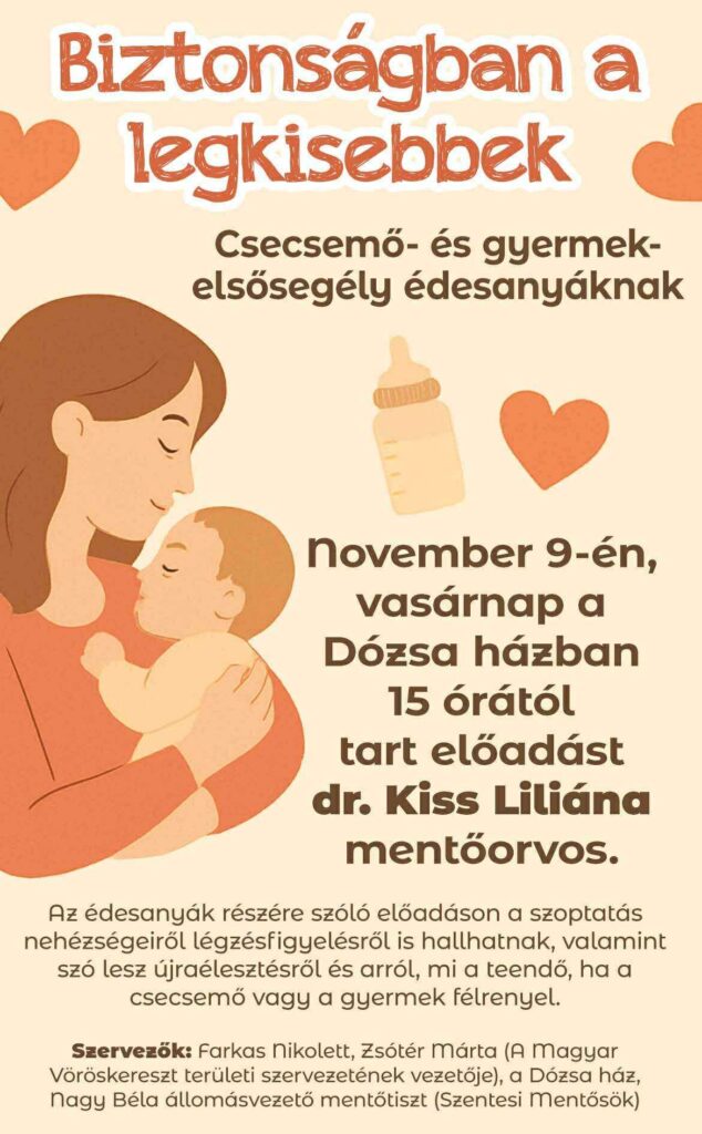 A legkisebbek biztonsága kerül a középpontba november 9-én, vasárnap, amikor dr. Kiss Liliána mentőorvos tart előadást a Dózsa házban, 15 órától. A program kifejezetten édesanyáknak szól, akik szeretnének felkészültebbek lenni a mindennapi és a váratlan helyzetekre egyaránt.