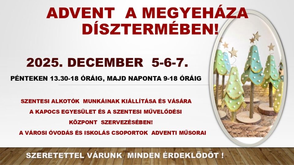December első hétvégéjén újra ünnepi hangulat költözik a Megyeháza Dísztermébe: december 5–6–7-én rendezik meg a hagyományos adventi kiállítást és vásárt, ahol helyi alkotók mutatják be kézműves munkáikat.