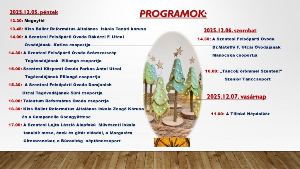 A rendezvény nemcsak vásárlási lehetőséget kínál, hanem igazi közösségi élményt is. A városi óvodás és iskolás csoportok adventi műsorokkal készülnek, hogy még meghittebbé tegyék a decemberi hétvégét.