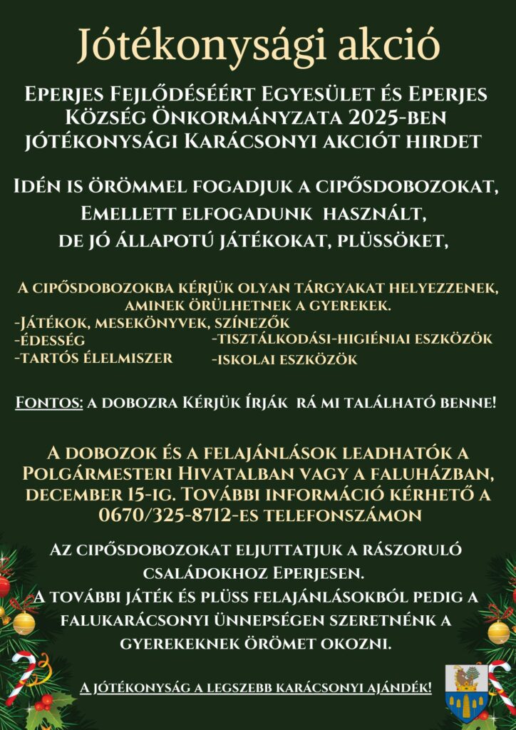 Eperjes Fejlődéséért Egyesület és Eperjes Község Önkormányzata idén is meghirdette hagyományos karácsonyi jótékonysági akcióját, amelynek célja, hogy minél több rászoruló helyi családnak tegyék szebbé az ünnepet. A szervezők 2025-ben is cipősdoboz-adományokat, valamint jó állapotú, használt játékokat és plüssöket gyűjtenek.