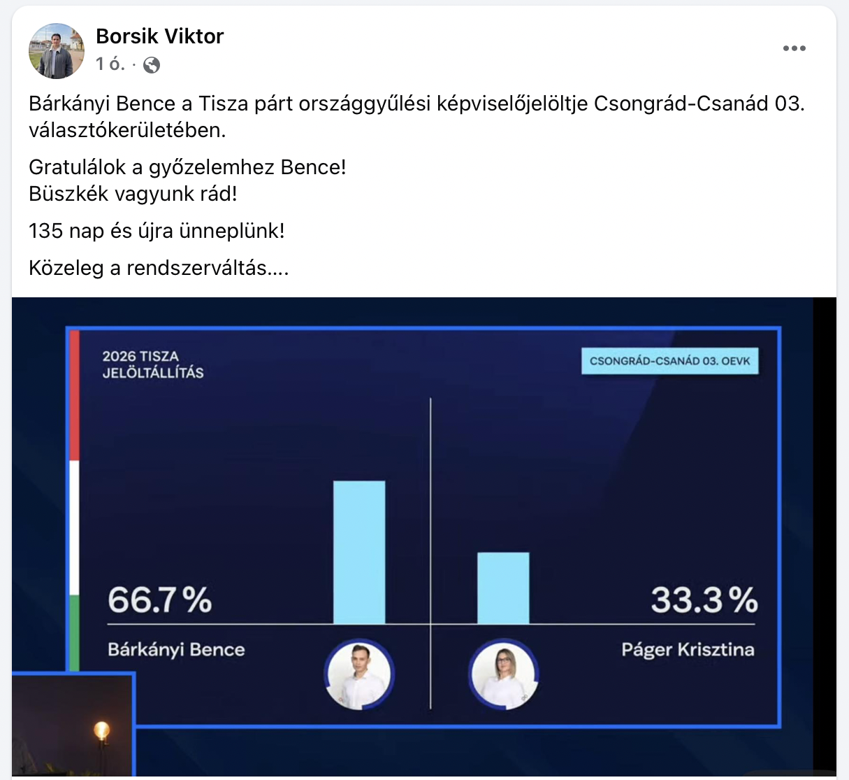 Tiszás forrásunk infói alapján már tegnap megírtuk, hogy Csongrád-Csanád vármegye 3-as számú választókerületében sem volt valós a szavazás, és már előre eldőlt, hogy a Momentumnak tesznek gesztust Magyar Péterék. Péntek este pedig hivatalosan is lilába borult az ellenzék: Bárkányi Bencét indítják.