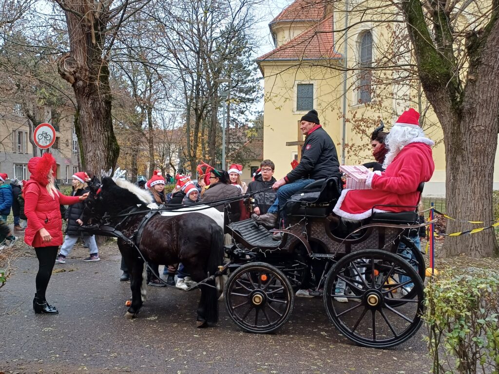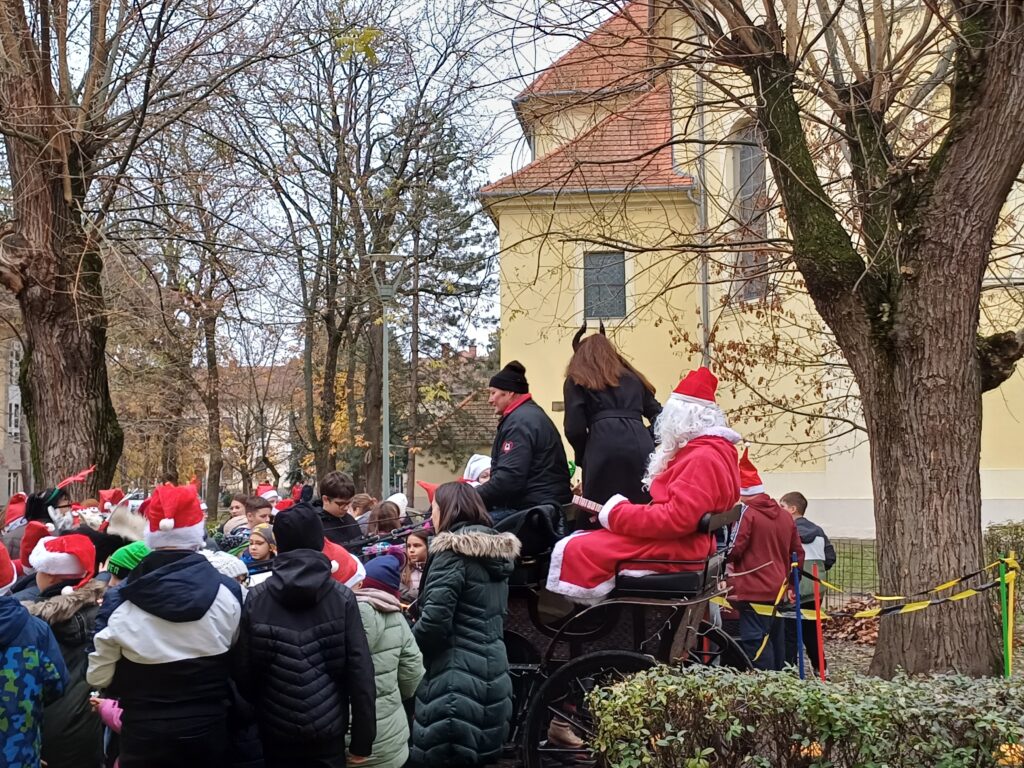 Így érkezett meg a Nagyboldogasszony Katolikus Általános Iskolába is, ahol a gyerekek már jóval a vendég érkezése előtt gyülekeztek az épület előtt. Mikulássapkában, sportos ruhában, izgatott mosollyal várták az ősz szakállú jótevőt. Természetesen a krampusz sem maradt távol, aki huncut jókedvvel érkezett, és szaloncukor-záport zúdított az ujjongva gyűjtögető gyerekekre.