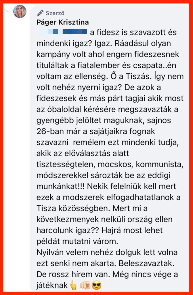 Úgy tűnik, messze nincs béke a Tisza Párt előválasztása után: Páger Krisztina nyilvánosan támadta meg a kisteleki győztest, Bárkányi Bencét, sőt – szavaiból ítélve – akár meg is próbálhatja ellehetetleníteni a nyertes indulását.