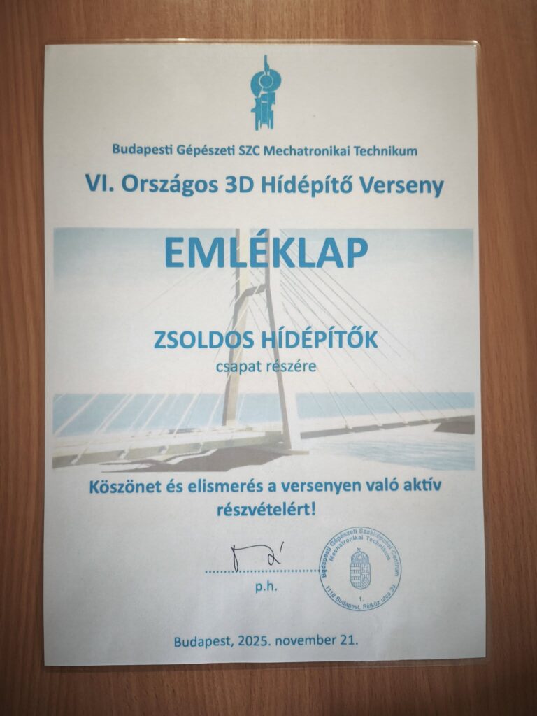 Bár a csapat ezúttal nem ért el dobogós helyezést, teljesítményüket emléklappal ismerték el, és értékes szakmai tapasztalatokkal gazdagodtak. A diákok lelkesedése, mérnöki gondolkodása és kitartó munkája bizonyította, hogy a Zsoldos technikuma továbbra is kiemelkedően teljesít az országos szakmai versenyeken.