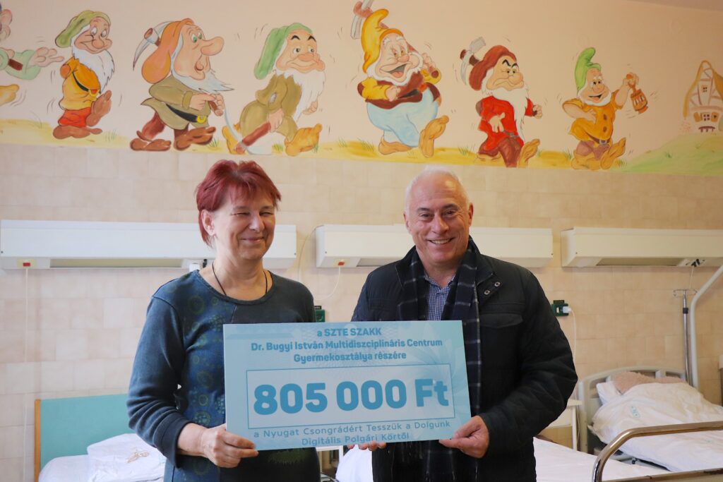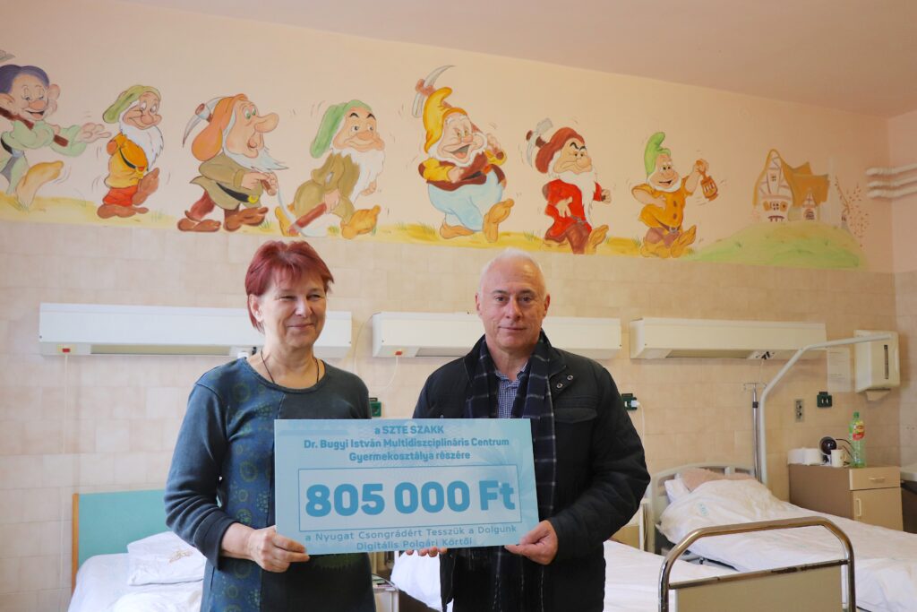 Szabó István, a Települési Önkormányzatok Országos Szövetségének vármegyei elnöke jelképesen is átadta azt a 805 ezer forintos támogatás, amelyet a Nyugat Csongrádért tesszük a dolgunk Digitális Polgári Kör, valamint az októberi Polgári Vacsora résztvevői gyűjtöttek össze a szentesi kórház csecsemő- és gyermekosztályának javára.