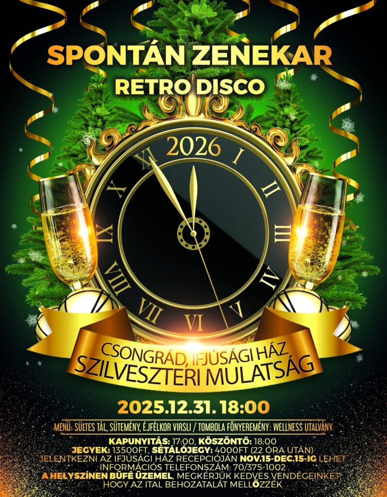 Idén 14. alkalommal rendezik meg Csongrádon az Ifjúsági Házban a város egyik legnagyobb múltú és legkedveltebb szilveszteri mulatságát, ahová a szervezők szeretettel várják mindazokat, akik jó hangulatban, közösen szeretnék búcsúztatni az óévet.