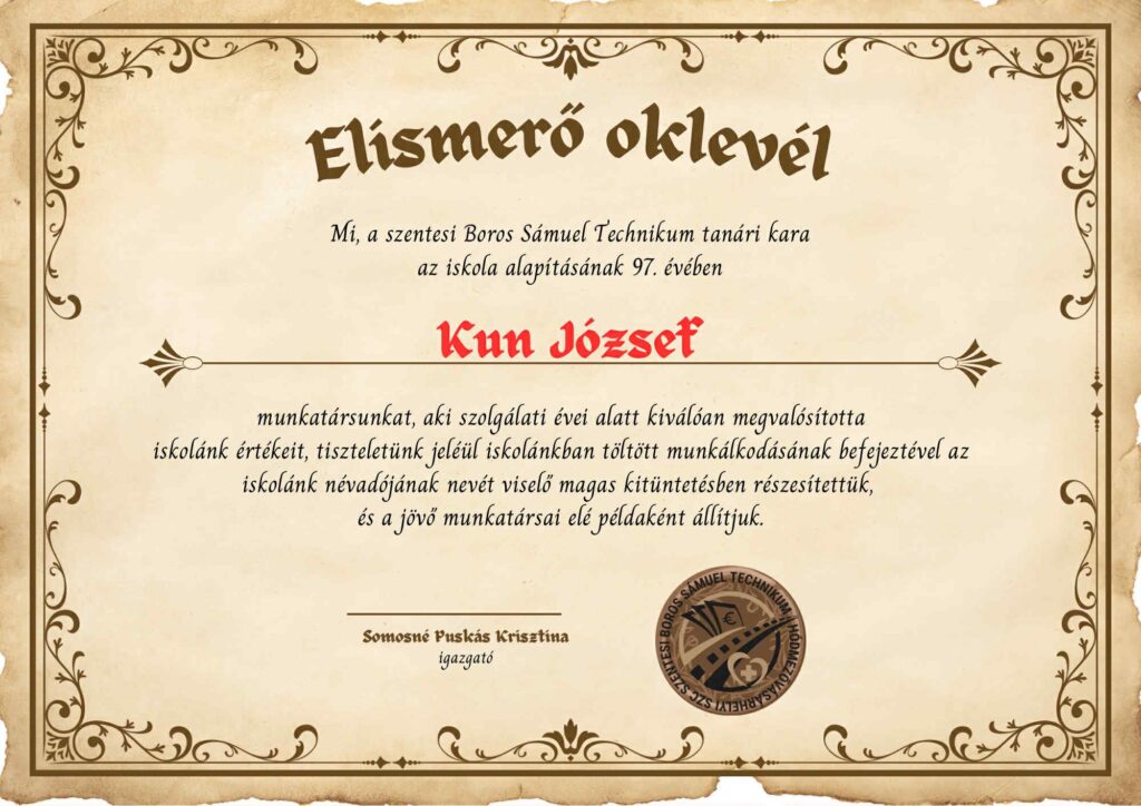 Kun József, akit mindenki csak Józsi bácsiként ismert, befejezte iskolai munkáját. Bár már évek óta nyugdíjas volt, szakértelme, tapasztalata és jó egészségi állapota lehetővé tette, hogy továbbra is aktívan segítse az iskola mindennapi működését. Feladatait mindig lelkiismeretesen, nagy odafigyeléssel látta el, munkájára mindenki számíthatott.