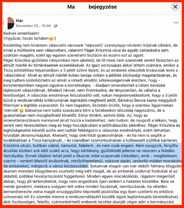 A Bárkányi-támogató hosszú bejegyzésében részletesen kifejti: Páger Krisztina és támogatói azóta sem tudták feldolgozni a vereséget, ezért folytatják a lejárató kampányt és a személyes támadásokat. “Ahelyett, hogy önkritikát gyakorolnának – és ha nem is segítik a továbbiakban a Tisza kampányát, – és csendben szomorkodnának a kútbaesett politikai karrieren, Krisztina utcán, boltban zaklat, bemutat, feljelent…és nem csak engem. Nem nyugszik, fenyőfa árusítás közben sok időt szakít arra, hogy kártékony, gyűlölködő jelleme ne vesszen a feledés homályába. Ennek látjátok tehát jeleit a Skacok oldal szaporodó cikkeiben, amik – megítélésem szerint – romlott lélekről árulkodnak, minősíthetetlenül, sokszor alpári, undorító módon mocskolnak be embereket, mérgezik a városi közbeszédet” – olvasható a bejegyzésben.
