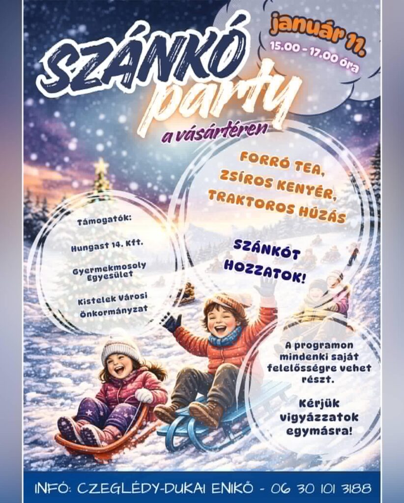 Igazi téli közösségi élményre hívják a családokat és baráti társaságokat Kisteleken: szánkópartyt rendeznek a vásártéren január 11-én, szombaton 15 és 17 óra között. A szervezők célja egyszerű, de annál vonzóbb: együtt kiélvezni a havat, a mozgást és a felszabadult téli örömöket.