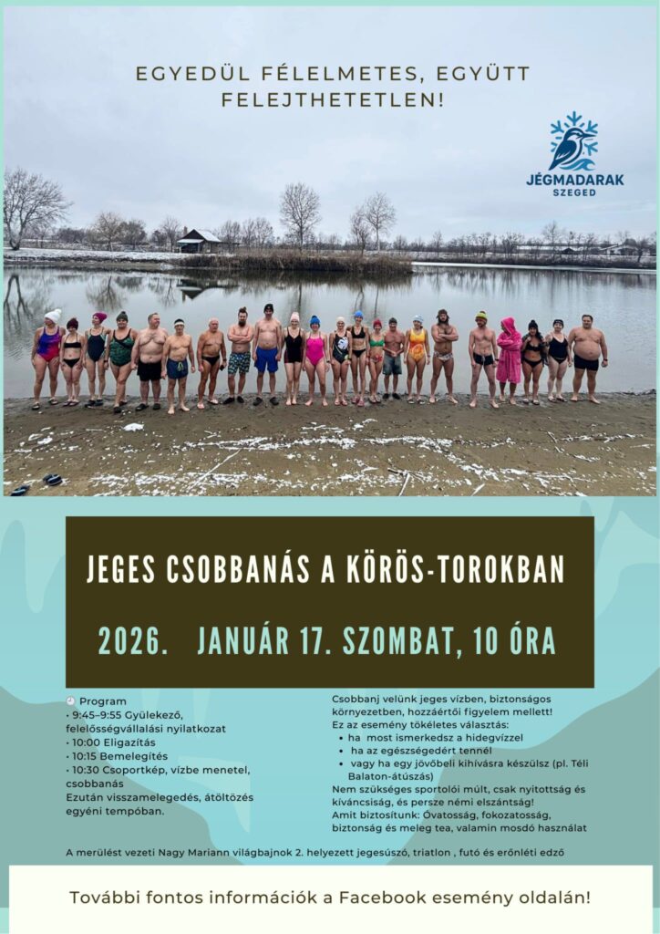 Különleges téli élményre készülnek a hideg víz szerelmesei: 2026. január 17-én, szombaton 10 órától jeges csobbanást rendeznek a Körös-toroknál. Az esemény célja az önmagunkkal való találkozás és a közösségi élmény megélése – biztonságos környezetben, szakértői felügyelettel.