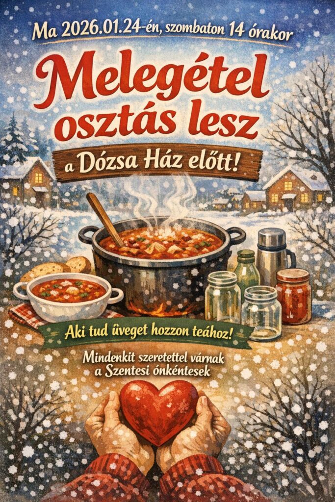 Szentesen 2026. január 24-én, szombaton 14 órától ismét meleg ételosztást tartanak a Dózsa Ház előtt, ahol a város rászorulói juthatnak egy tál finom ételhez. Az akciót a szentesi önkéntes asszonyok szervezik, akik immár hét éve dolgoznak fáradhatatlanul azért, hogy segítséget nyújtsanak azoknak, akiknek a legnagyobb szükségük van rá.