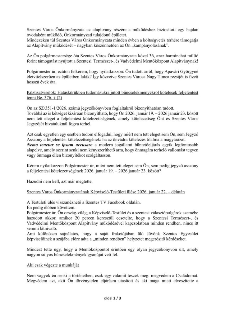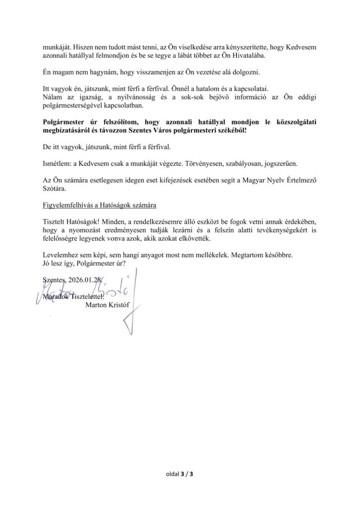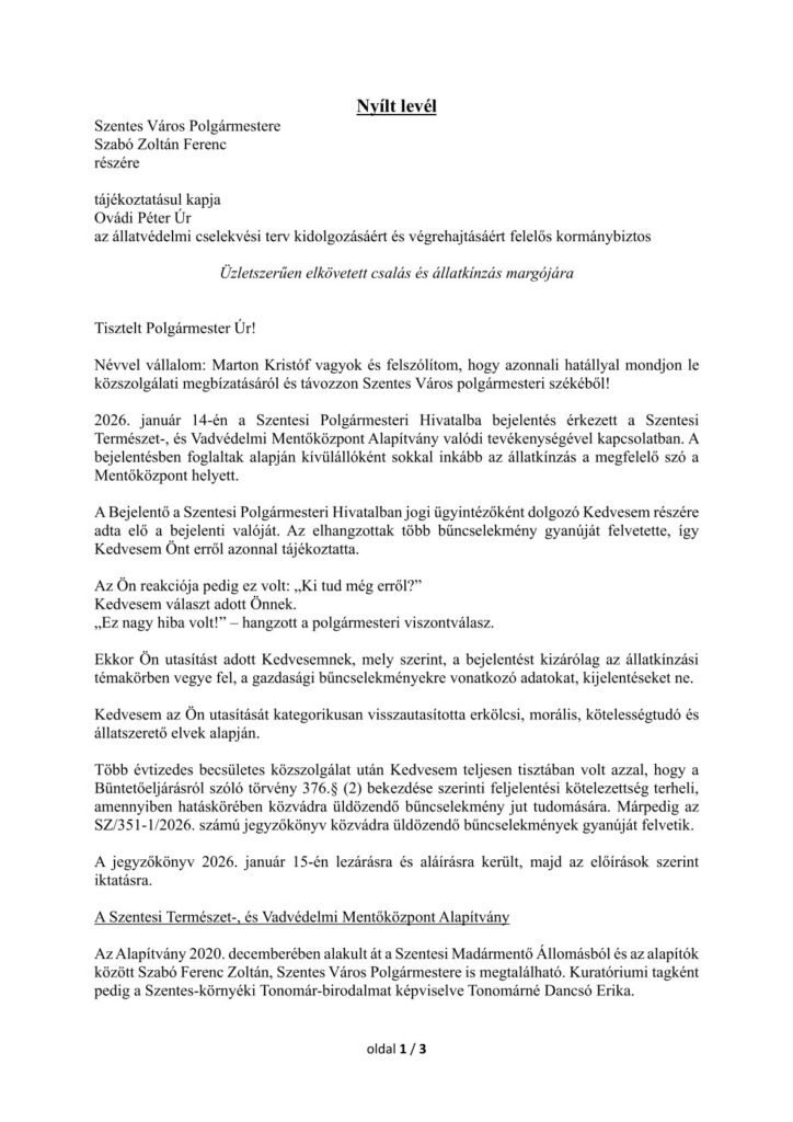 Az érintett párja, Marton Kristóf most nyílt levelet írt Szentes polgármesterének. Ebben felszólítja Szabó Zoltán Ferencet, hogy hogy azonnali hatállyal mondjon le közszolgálati megbízatásáról és távozzon Szentes Város polgármesteri székéből!