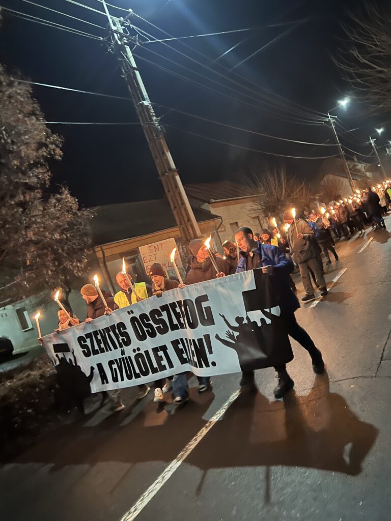 A demonstráció gyülekezési helyszíne az Arany János utca – Rákóczi Ferenc utca kereszteződése vol, majd a résztvevők fáklyákkal a kezükben vonultak a Kossuth térre, jelezve: a közösség nem kér a gyűlöletből, és nemet mond Krisztina, Zsolt, Zoltán, Márton, Tibor, Eszter és Antal uszítására.