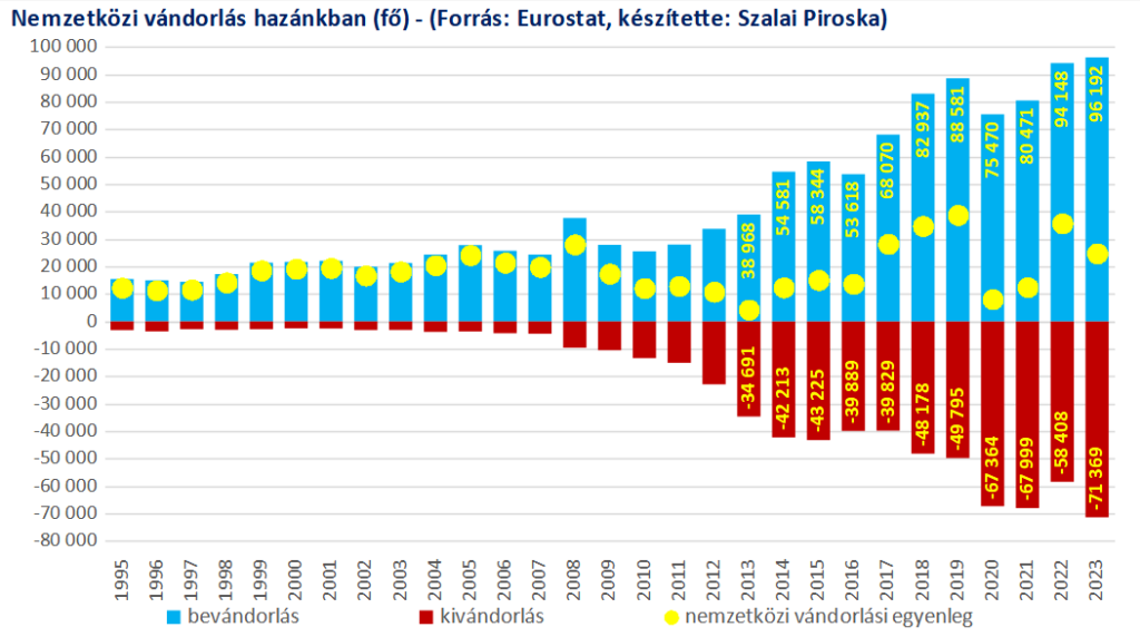 A statisztikák szerint 1995 és 2024 között összesen 762 ezren vándoroltak ki Magyarországról – ebben benne vannak azok a külföldiek is, akik ideiglenes munkavállalás vagy tanulmányok után hazatértek. Ugyanebben az időszakban 1 millió 303 ezren költöztek be vagy tértek vissza az országba, vagyis közel kétszer annyian érkeztek, mint ahányan távoztak.