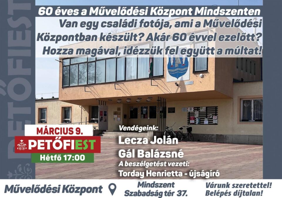 Különleges jubileumhoz érkezett Mindszent kulturális élete: 60 éves a Művelődési Központ. Az évforduló alkalmából ünnepi Petőfi Estre várják az érdeklődőket 2026. március 9-én, 17 órától a Keller Lajos Művelődési Központ és Könyvtárban. A belépés díjtalan!