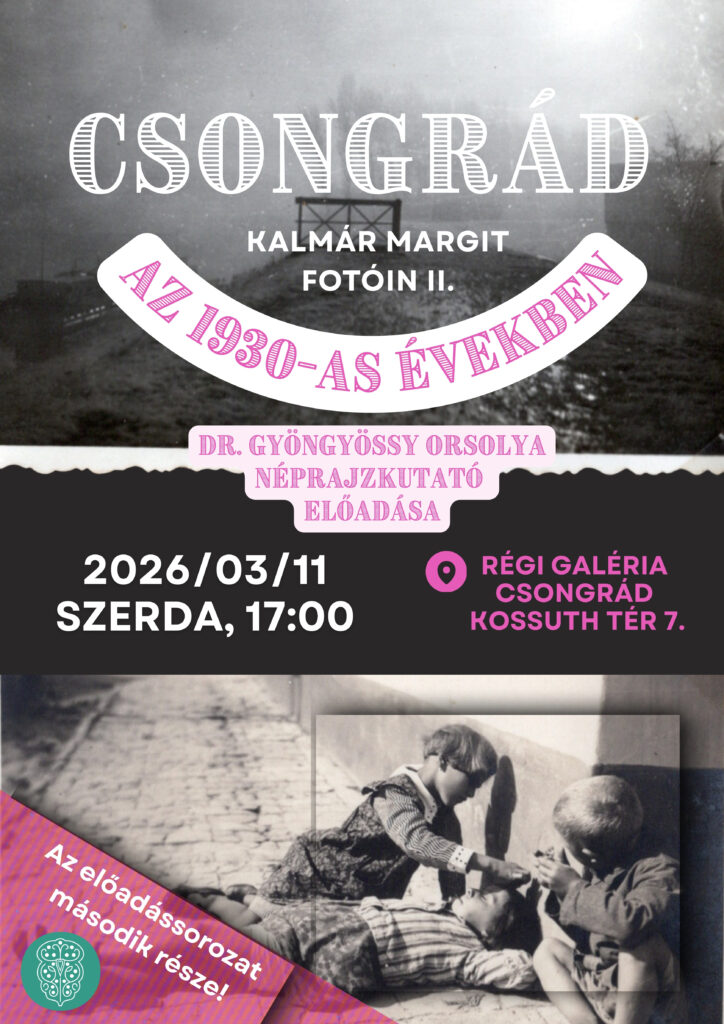Az előadás középpontjában Kalmár Margit személye és fényképgyűjteménye áll. A résztvevők megtudhatják, ki volt a fotók készítője, milyen körülmények között születtek a képek, és mit árulnak el a múlt mindennapjairól. A régi fényképek nemcsak családi emlékek, hanem fontos történeti források is. Segítségükkel egy-egy korszak hétköznapjai, a csongrádiak élete és személyes történetek is megelevenednek.