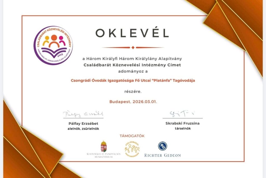 A Csongrádi Óvodák Igazgatósága Fő Utcai „Platánfa” Tagóvodája elnyerte a Családbarát Köznevelési Intézmény Címet. Az elismerést azoknak az intézményeknek ítélik oda, amelyek hiteles módon, jó gyakorlatokon keresztül képviselik a munka és a magánélet egyensúlyának fontosságát, miközben kiemelt figyelmet fordítanak a pedagógusok, a dolgozók a szülők és a gyermekek igényeire.