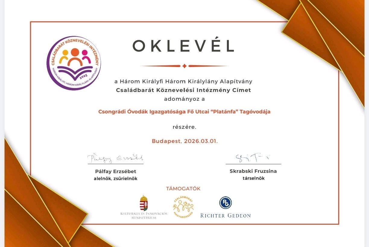 A Csongrádi Óvodák Igazgatósága Fő Utcai „Platánfa” Tagóvodája elnyerte a Családbarát Köznevelési Intézmény Címet. Az elismerést azoknak az intézményeknek ítélik oda, amelyek hiteles módon, jó gyakorlatokon keresztül képviselik a munka és a magánélet egyensúlyának fontosságát, miközben kiemelt figyelmet fordítanak a pedagógusok, a dolgozók a szülők és a gyermekek igényeire.