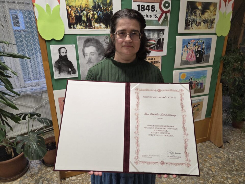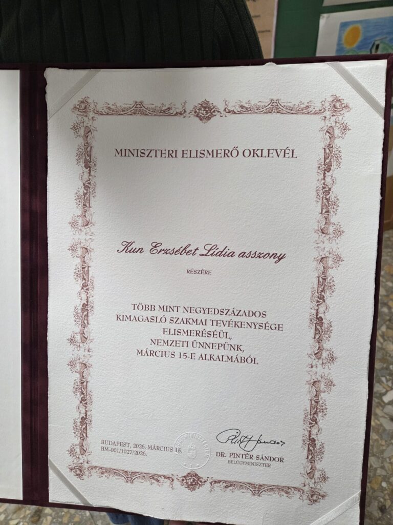 A nemzeti ünnep alkalmából miniszteri elismerő oklevelet vehetett át Kun Erzsébet Lídia, a Szentesi Koszta József Általános Iskola pedagógusa és igazgatóhelyettese, aki hosszú évek óta dolgozik elhivatottan a diákok és az intézmény közösségéért.