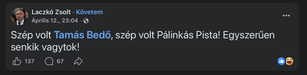 A csongrádi önkormányzati képviselő és a Mi Hazánk bukott képviselőjelöltje nem tudta tisztességgel és méltósággal viselni, hogy csúnyán alulmaradt. Míg mások csendben maradtak és/vagy gratuláltak a nyertesnek, Laczkó Zsolt elszabadult a Facebook oldalán és egyik választási ellenfelét és Csongrád polgármesterét mocskolta, meglehetősen undorító formában. Hiába, a stílus maga az ember.