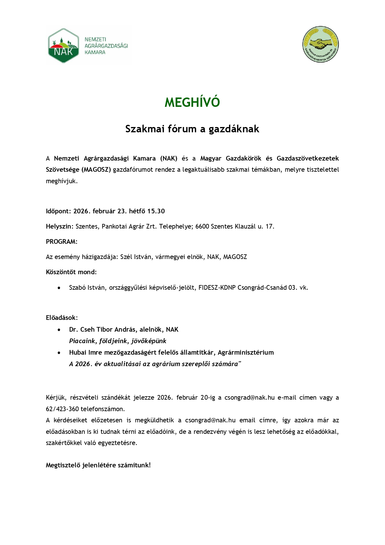 Gazdafórumot tartanak Szentesen: a 2026-os agrárév kihívásai és lehetőségei kerülnek fókuszbacs3-szerkeszto2026.02.19.2026.02.19.2026.02.19.2026.02.19.0