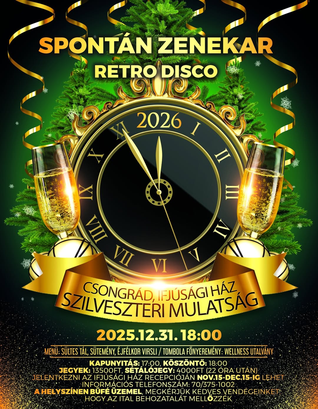 Szilveszteri mulatság – Csongrád + Google Naptárba mentés + iCal / Outlook export 00 Nap 00 óra 00 perc 00 másodperc dátum dec 31 2025 - jan 01 2026 időpont 18:00 - 06:00 kategória Csongrád Megosztás Térségünk Diákok készítették az idei advent kedvenceit: őrbódé és játszóházikó díszíti Csongrád főterétcs3-szerkeszto2025.12.04.2025.12.04.2025.12.04.2025.12.04.0Hálaadó misén mondott köszönetet Baks közössége az iskola, óvoda és bölcsőde fenntartójának + GALÉRIA!cs3-szerkeszto2025.12.04.2025.12.04.2025.12.04.2025.12.04.0„Rajtunk múlik… és tesszük is” – könyvbemutatóval zárta 40 éves pályafutását Kádár Katacs3-szerkeszto2025.12.04.2025.12.04.2025.12.04.2025.12.04.0Szentes elengedte, az egyház megfogta a nagytőkei óvoda kezétcs3-szerkeszto2025.12.04.2025.12.04.2025.12.04.2025.12.04.0A DélKerTÉSZ nyerte az Év kertészete díjat a Portfolio Agrárszektor 2025 konferenciáncs3-szerkeszto2025.12.04.2025.12.04.2025.12.04.2025.12.04.0Mikulás-járás Szentesen: a 7-es és 8-as körzetben is megérkezik a Nagyszakállú!cs3-szerkeszto2025.12.04.2025.12.04.2025.12.04.2025.12.04.0Szívből jövő kedvesség: újra vár a Mikulás-ház Csongrádoncs3-szerkeszto2025.12.04.2025.12.04.2025.12.04.2025.12.04.0Csongrád óvónénijei évek óta varázsolnak karácsonyi csodát az önkormányzat épületébecs3-szerkeszto2025.12.03.2025.12.02.2025.12.03.2025.12.02.0Összefogásból született meg Csongrád első horgolt karácsonyfájacs3-szerkeszto2025.12.03.2025.12.02.2025.12.03.2025.12.02.0Agrárturisztikai díjat kapott a bokrosi közösség motorja – Ungerbauer Anikó munkáját vármegyei elismeréssel jutalmaztákcs3-szerkeszto2025.12.03.2025.12.03.2025.12.03.2025.12.03.0